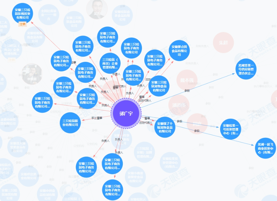 天眼查显示,郭广宇在22家公司任职,担任17家公司的法定代表人和7家公司的高管,记者查阅发现这些公司与三只松鼠存在密切关联。如安徽三只松鼠电子商务有限公司、三只松鼠(南京)企业管理有限公司等均由三只松鼠全资持股。