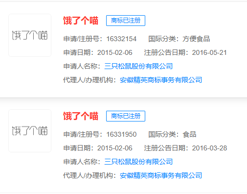 据了解,三只松鼠于2016年注册了商标“饿了个喵”,涉及分类包括方便食品、食品、啤酒饮料、饲料种籽等。