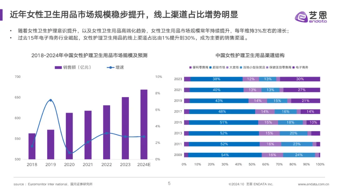 《2024女性卫生用品行业趋势洞察报告》指出,随着电子商务行业崛起,女性护理卫生用品的线上渠道占比由1%提升到30%,成为主要销售渠道。