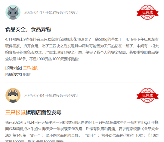 证券之星注意到,在黑猫投诉平台上,三只松鼠相关投诉中,涉及产品存在食品安全风险的问题占比最高。另外,公司个别产品还曾被市场监督部门抽检出不合格。例如在2021年,市场监管总局发布关于20批次食品抽检不合格情况的通告显示,三只松鼠1批次开口松子产品过氧化值(以脂肪计)超标,随后公司致歉并表示进行改正。