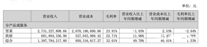 分产品来看,今年上半年,其坚果收入同比下跌了1.03%至27.31亿元,综合产品收入同比增长49.70%至13.98亿元,烘焙产品收入同比增长了11.96%至6.82亿元。而在毛利率层面,今年上半年,其坚果下跌了2.64%至23.91%;综合产品毛利率同比增长了1.53%至32.01%,烘焙产品毛利率同比增长了1.09%至22.71%。