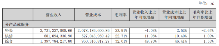 坚果是三只松鼠全品类中的核心产品,并且公司也是在坚果零食基础之上新增“现制烘焙+生鲜+日化”等多个高频刚需品类。今年上半年,坚果产品实现收入27.31亿元,收入占比仍接近五成,然而其增速却出现1.03%的负增长,整体毛利率也较上年同期下滑2.64%。