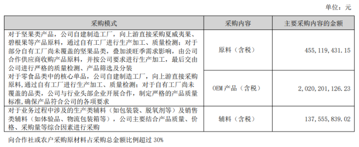 三只松鼠在半年报中表示,对于部分自有工厂尚未覆盖的坚果品类,由公司合作供应商收购产品原料,并按公司要求进行生产加工;对于零食品类中的核心单品,自有工厂尚未覆盖的品类,由公司与行业头部企业开展合作。今年上半年,公司对OEM产品的采购金额高达20.2亿元,不仅远超同期4.55亿元的原料采购,且较上年同期的16.76亿元的OEM产品采购金额呈现大幅增长。代工模式下,公司不仅需要承担原料采购与加工费双重成本,且品控风险也易影响品牌声誉。
