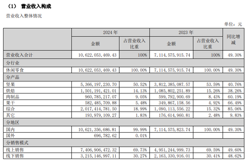 作为“国民零食第一股”,坚果品类始终是三只松鼠的立业根基与营收核心支柱。2024年,该品类贡献营收53.66亿元,同比增长40.76%,营收占比超总营收的50%,正是依靠坚果业务的强势拉动,公司全年营收才得以重返百亿台阶。
