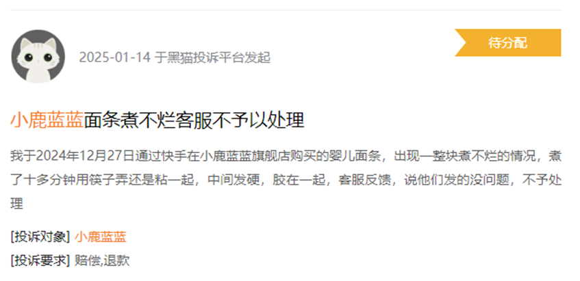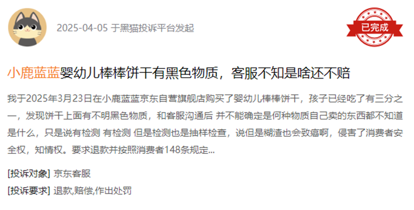 当前,在黑猫投诉平台上,三只松鼠累计投诉量已超2600条,大量投诉集中在发霉、异物等质量问题;专注婴童市场的小鹿蓝蓝,相关投诉也不少,有消费者反映购买的婴幼儿棒棒饼干中出现不明黑色物质、食品霉变,更有消费者提及,所购婴儿面条煮制10多分钟后仍粘连成团,无法煮透,食品安全问题已成为品牌难以摆脱的困扰。