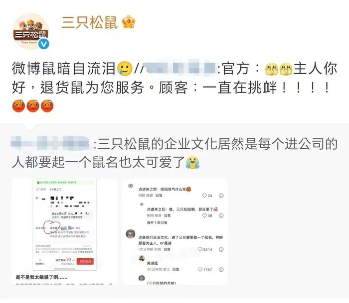 更让人想不到的是,三只松鼠的松鼠式语言“退货鼠”三个字做收件名,因有消费者感到被隐隐暗讽和冒犯而被推向热搜,直至三只松鼠官方通过社交媒体进一步作出回应,才得以解开误解。