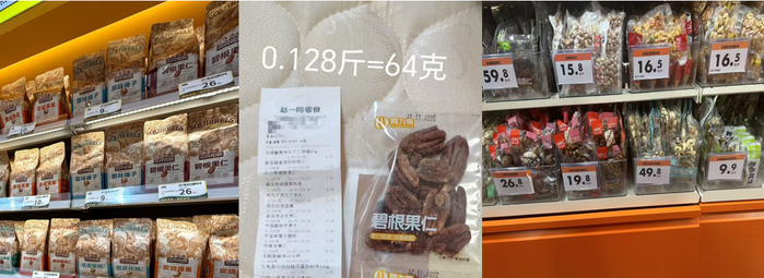 为了更好体验价格上的差异,我们分别在不同的线下零食店选取同一商品比较,但因为量贩零食品牌差异各不同,而三只松鼠是自有品牌,所以品牌选取是不同。