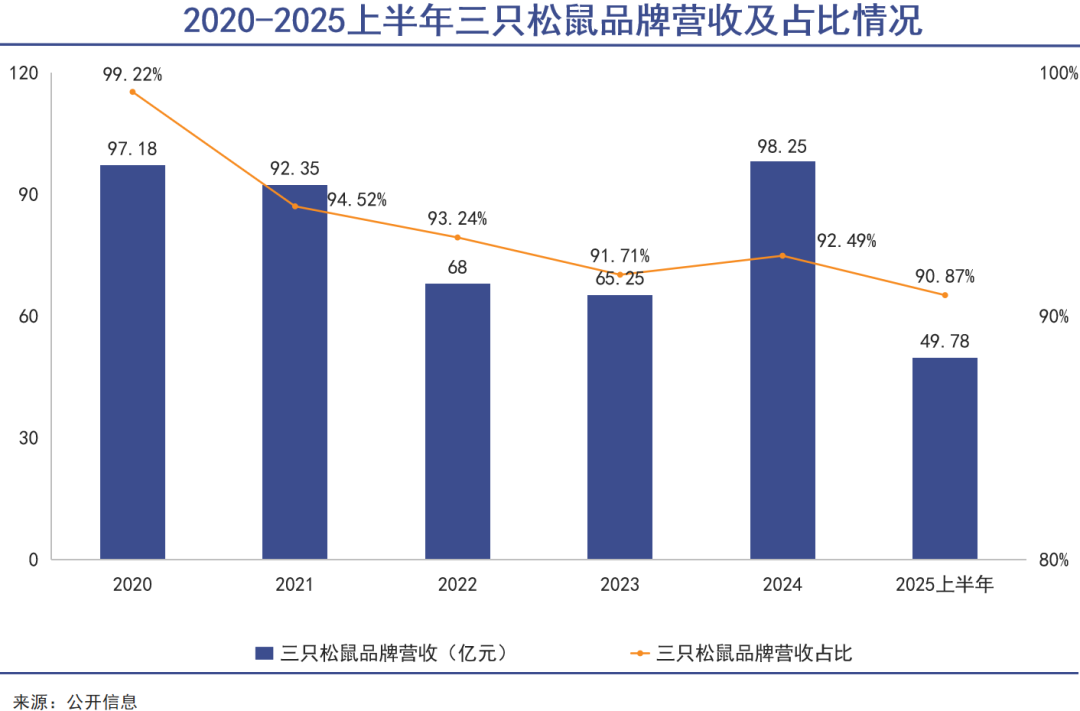 长期以来,三只松鼠品牌的营收一直占其总营收的90%以上,其他子品牌仍处于孵化阶段,贡献有限。直至2025年上半年,三只松鼠品牌的休闲零食依然是公司的核心收入来源。
