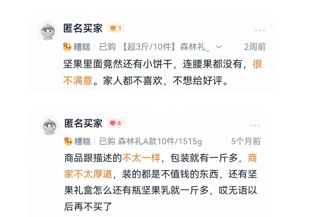记者浏览商品评价发现,一些消费者收货后才意识到礼盒中含有大量非坚果产品。在网店中,有消费者评价,“好点的坚果少,便宜的花生、青豆多”“一箱里竟有3瓶饮料”“坚果礼盒里还有小饼干”……