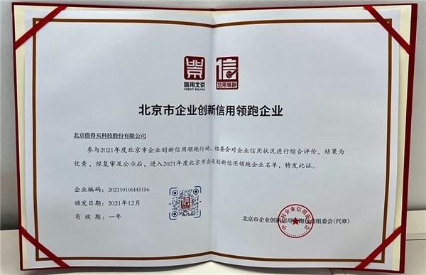 近日,2021年北京市信用领跑企业名单公布。凭借在企业信用方面的优秀表现,北京值得买科技股份有限公司荣获“北京市企业创新信用领跑企业”称号和企业综合信用评价等级证书。