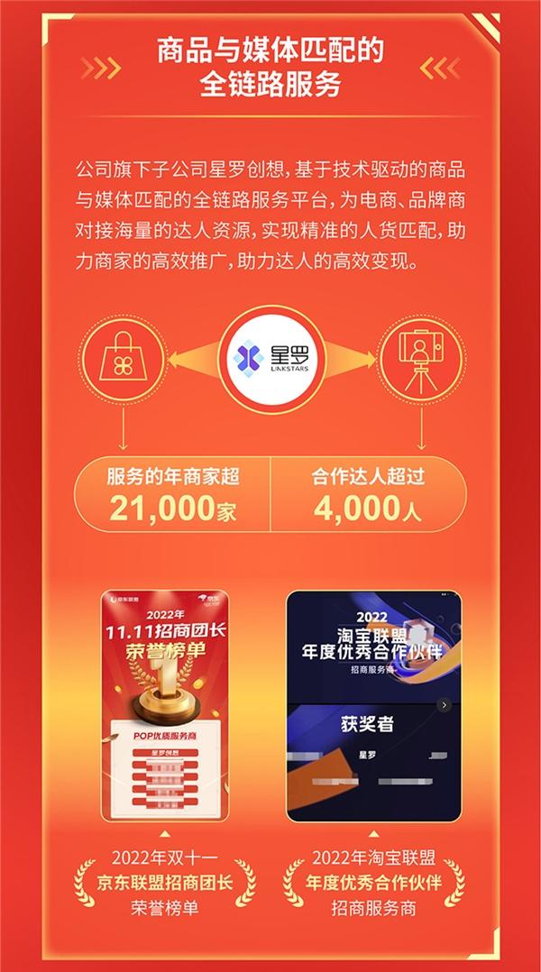 由子公司“星罗创想”主导的“商品与媒体匹配的全链路服务”,实现了商家与达人数量的快速增长——服务商家超21,000家,合作达人超过4,000人。2022年,凭借出色的业务表现,星罗创想入选了“618京东联盟招商团长爆款势力榜TOP5”、“双十一京东联盟类目专精团长评选”、“双十一京东联盟招商团长荣誉榜单”、“淘宝联盟年度优秀合作伙伴-招商服务商”、“淘宝联盟9月美妆大赛招商团长卓越奖”。