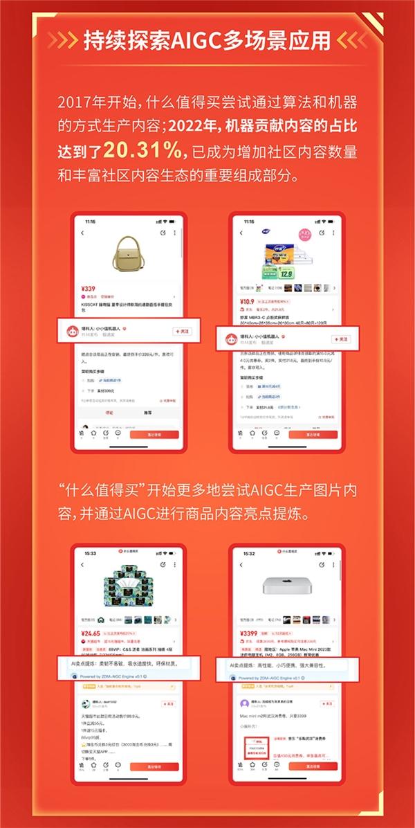 早在2017年,“什么值得买”就开始尝试通过算法和机器的方式生产内容。2022年,机器贡献内容在“什么值得买”内容发布总量中的占比,已提升至20.31%。2022年第四季度,“什么值得买”已开始更多地尝试通过AIGC产生图片、商品亮点提炼等内容。