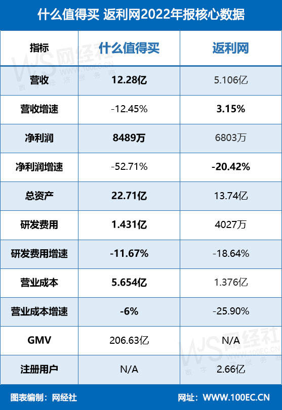 整体来看,什么值得买在营收和净利润、总资产、研发费用、营业成本的体量上均超过返利网,不过,什么值得吗的营收下滑,而返利网则实现微涨。不过,两家公司的净利润都呈现负增长,研发费用同比均有所下滑。