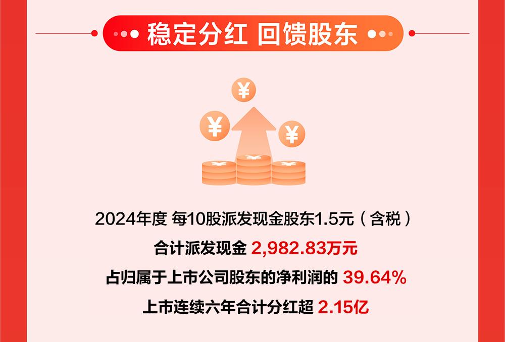 同时,值得买科技始终高度重视“持续稳定提升股东回报”,每年均合理制订年度利润分配方案,以切实保障全体股东的利益。2024年度,值得买科技现金分红2982.83万元,占归属于上市公司股东的净利润的39.64%,上市以来连续六年合计分红近2.15亿元。