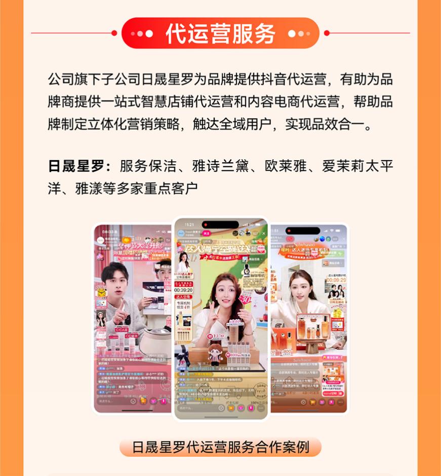 重点开展抖音平台“代运营服务”(抖音DP服务)的日晟星罗,依托值得买科技的消费数据优势和AI能力,通过结合品牌特性、货品、内容和人群特点,有效帮助品牌发掘全域兴趣电商的破局点、开创增长新路径,在2024年继续保持快速发展,连续3年获得“抖音电商钻石服务商”评级认证,服务于多个知名国际美妆个护集团及品牌。