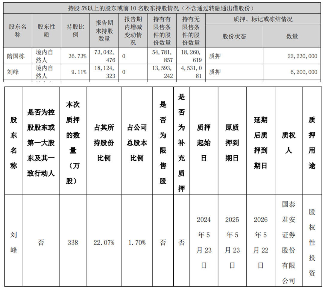 根据值得买2024年年报及相关公告显示,公司股东隋国栋所持股份中的2223.00万股被质押,占公司总股本的11.18%。另外第二大股东刘峰所持338.00万股被质押,二人质押股份合计占公司总股本的12.88%。