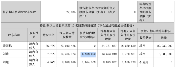 其中,刘峰在2025年1月至2月期间,以集中竞价交易和大宗交易的方式,共减持公司280.82万股股份,减持比例为1.41%,共套现1.04亿元。本次减持后,刘峰持股比例由9.11%下滑至7.7%。