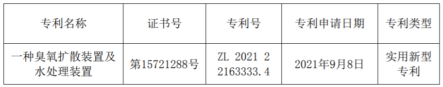 该专利“一种臭氧扩散装置及水处理装置”为水处理工艺中采用曝气法的臭氧扩散器水气混合装置,采用错位精准间距设计,提高臭氧气体水溶混合效率和接触反应面积,最大限度减小扩散气体未覆盖区域,避免相邻扩散器的相互干扰,增强传质效率,提高臭氧利用率。该项技术已经应用于臭氧水处理工艺,使用效果良好。