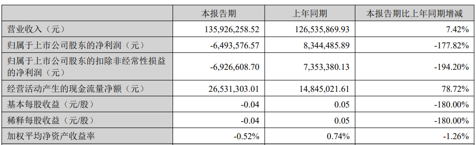 中国经济网北京9月19日讯近日,国林科技(300786.SZ)公布2023年半年度报告。今年上半年,公司实现营业收入1.36亿元,同比增长7.42%;归属于上市公司股东的净利润为-649.36万元,上年同期为834.45万元,同比盈转亏;归属于上市公司股东的扣非净利润为-692.66万元,上年同期为735.34万元;经营活动产生的现金流量净额2653.13万元,同比增长78.72%。