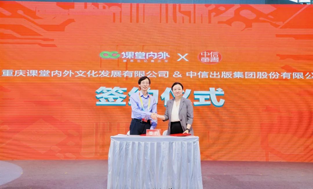 发布会上,中信出版集团副总经理朱虹与重庆课堂内外董事长简渠签署战略合作协议,双方将共建包含出版物矩阵、AI素养测评、赛事培训等多维度的青少年AI素养培育生态。