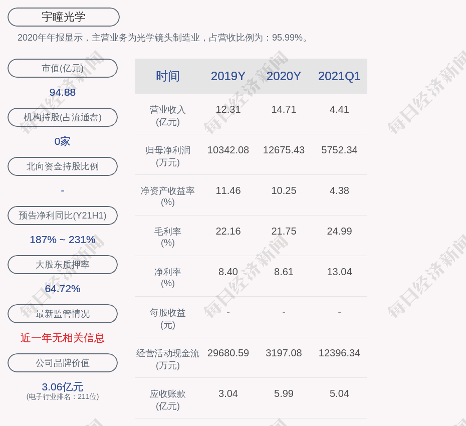 2020年年报显示,宇瞳光学的主营业务为光学镜头制造业,占营收比例为:95.99%。