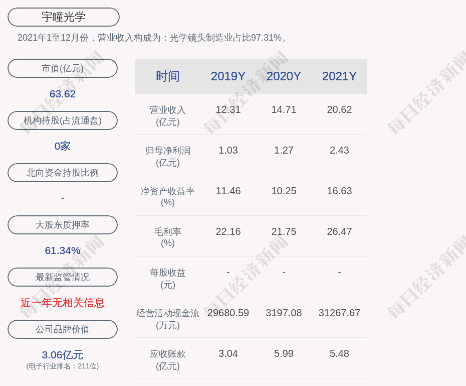 2021年1至12月份,宇瞳光学的营业收入构成为:光学镜头制造业占比97.31%。