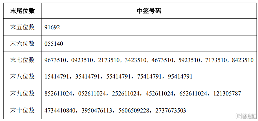 凡参与宇瞳转债网上申购的投资者持有的申购配号尾数与上述号码相同的,则为中签号码。中签号码共有11.4295万个,每个中签号码能且仅能认购10张宇瞳转债。