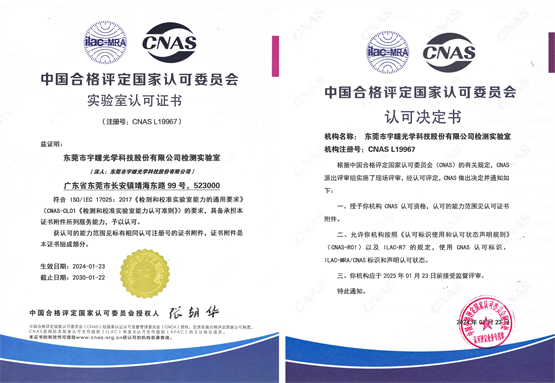 近日,东莞市宇瞳光学科技股份有限公司检测实验室(以下简称“宇瞳光学检测实验室”)荣获中国合格评定国家认可委员会(CNAS)的实验室认可,标志着宇瞳光学检测实验室在光学检测领域的技术实力和标准化管理水平达到了新的高度。