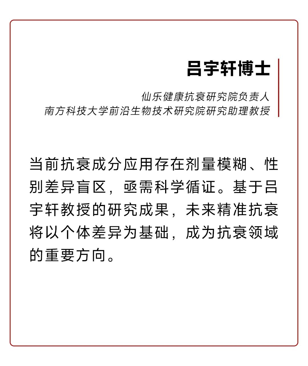 南方科技大学前沿生物技术研究院及医学院研究助理教授吕宇轩博士担任仙乐健康抗衰研究院负责人,并牵头组织科学委员会,连接全球前沿学术资源,助力抗衰产业的全球协同创新。科委会首期成员包括密歇根大学病理学教授、Paul Glenn 衰老生物学中心主任Richard A. Miller博士,清华大学药学院教授王钊博士以及莱布尼茨老龄化研究所高级组长Dario Riccardo Valenzano教授。