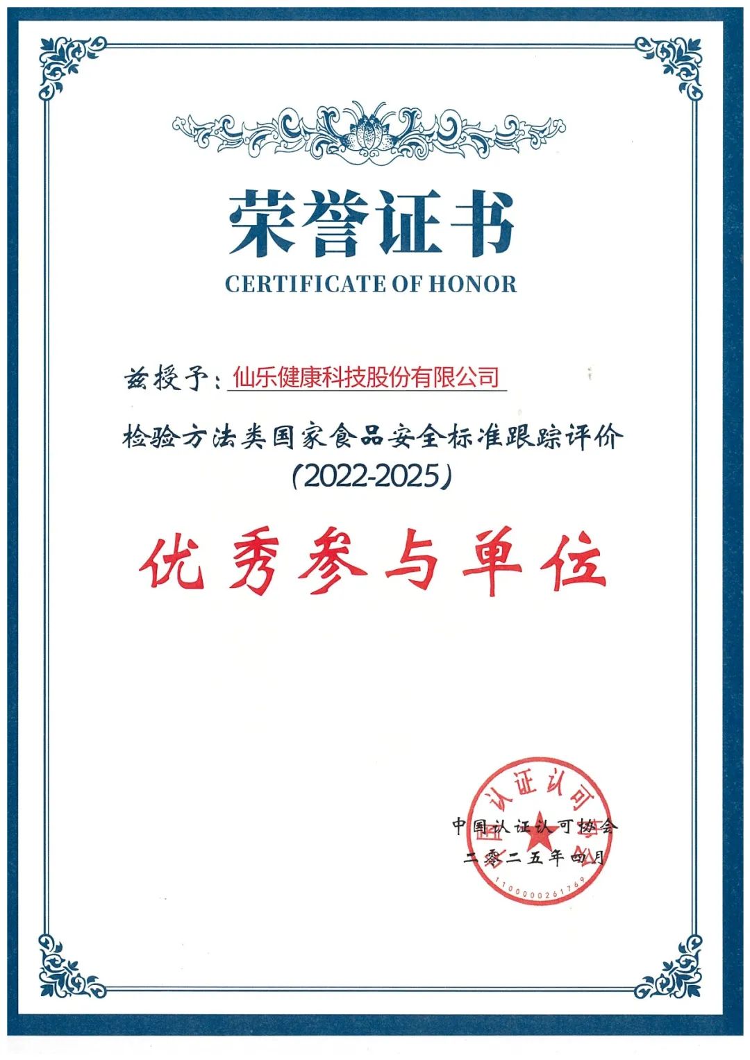 近日,仙乐健康荣获中国认证认可协会颁发的“检验方法类国家食品安全标准跟踪评价(2022-2025)优秀参与单位”称号。该荣誉的获得,标志着仙乐健康在国家食品安全标准体系建设中的技术实力获得高度认可,助力推动食品行业迈向高质量方向发展。