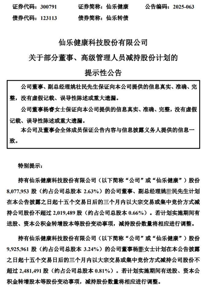 2025年7月初,仙乐健康发布一则公告。公司董事、副总经理姚某民和董事杨某相继宣布减持计划,拟分别减持不超过201.95万股和248.15万股,合计占公司总股本比例达1.47%。减持窗口定为2025年7月25日至10月24日,将通过大宗交易或集中竞价方式进行。