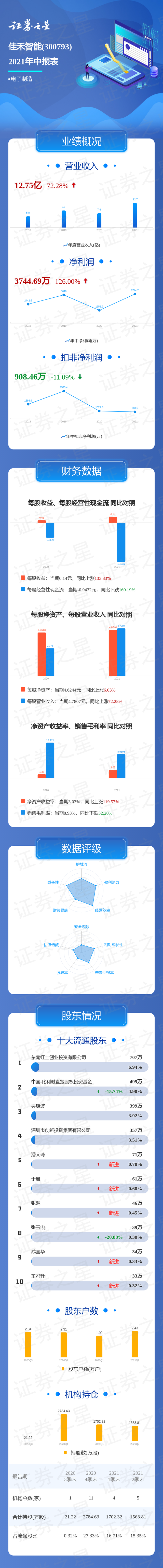 佳禾智能2021中报显示,公司主营收入12.75亿元,同比上升72.28%;归母净利润3744.69万元,同比上升126.0%;扣非净利润908.46万元,同比下降11.09%;负债率52.46%,投资收益626.52万元,财务费用1201.08万元,毛利率8.93%。