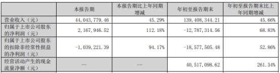今年第三季度,公司营业收入为4404.38万元,同比增长45.29%;归属于上市公司股东的净利润为216.79万元,同比增长112.18%;归属于上市公司股东的扣除非经常性损益的净利润为-103.92万元,同比增长94.17%。