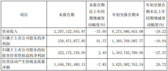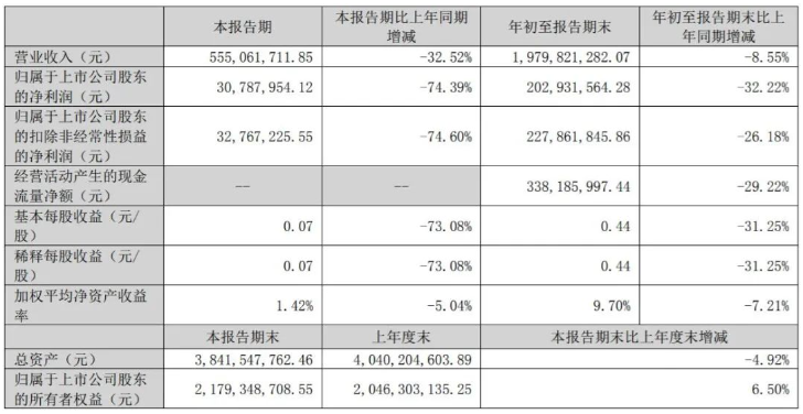2023年1~3季度,中旗股份实现营业收入1,979,821,282.07元,同比下降8.55%;归属于上市公司股东的净利润为202,931,564.28元,同比下降32.22%;归属于上市公司股东的扣除非经常性损益的净利润为227,861,845.86元,同比下降26.18%。