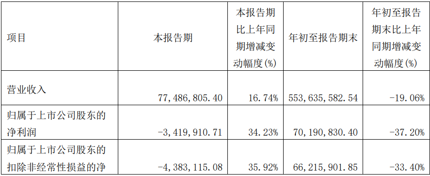 辉丰股份10月26日发布三季度业绩公告称,2023年前三季度营收约2.27亿元,同比增加11.67%;归属于上市公司股东的净利润亏损约1.02亿元,同比减少53.9%;基本每股收益亏损0.0676元,同比减少53.64%。其中,第三季度实现营业收入3849.57万元,同比下降41.91%;归属于上市公司股东的净利润亏损5340.23万元,同比下降91.82%。