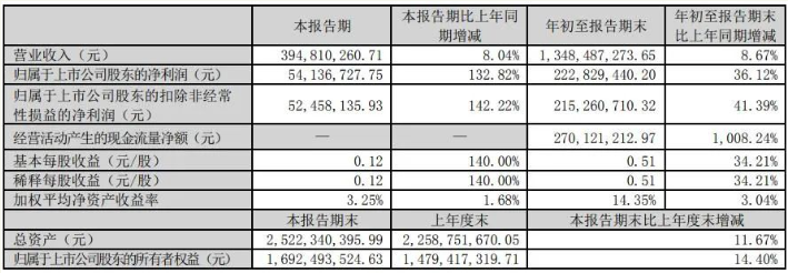 2023年前三季度,国光股份实现营业收入13.48亿元,同比增长8.67%;实现归属于上市公司股东的净利润2.23亿元,同比增长36.12%;实现归属于上市公司股东的扣除非经常性损益的净利润2.15亿元,同比增长41.39%。