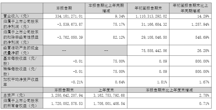最新财报显示,今年前三季度公司实现营业总收入11.1亿元,同比增长14.29%;归母净利润3116.67万元,同比增长1257.94%;扣非净利润2910.8万元,同比扭亏。