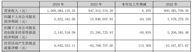 2024年,公司实现营业收入10.09亿元,同比增长6.45%;归属于上市公司股东的净利润565.23万元,同比下降64.34%;归属于上市公司股东的扣除非经常性损益的净利润214.55万元,同比下降90.83%;经营活动产生的现金流量净额964.26万元,上年同期为-6276.87万元。