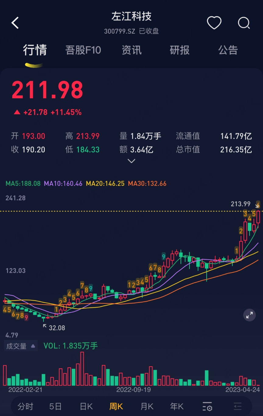 但A股资金完全不顾这些风险,股价从2022年4月最低点32.08元/股拉到如今213.99元/股,市值从30多亿疯狂炒到216亿。