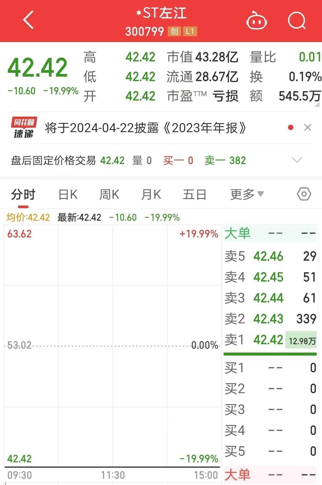 1月31日,*ST左江复牌后一字跌停。截至收盘,跌停板上封单达12.98万手。*ST左江发布的2023年业绩预告显示,公司预计2023年实现归属于上市公司股东的净利润为亏损1.6亿元至2.25亿元。