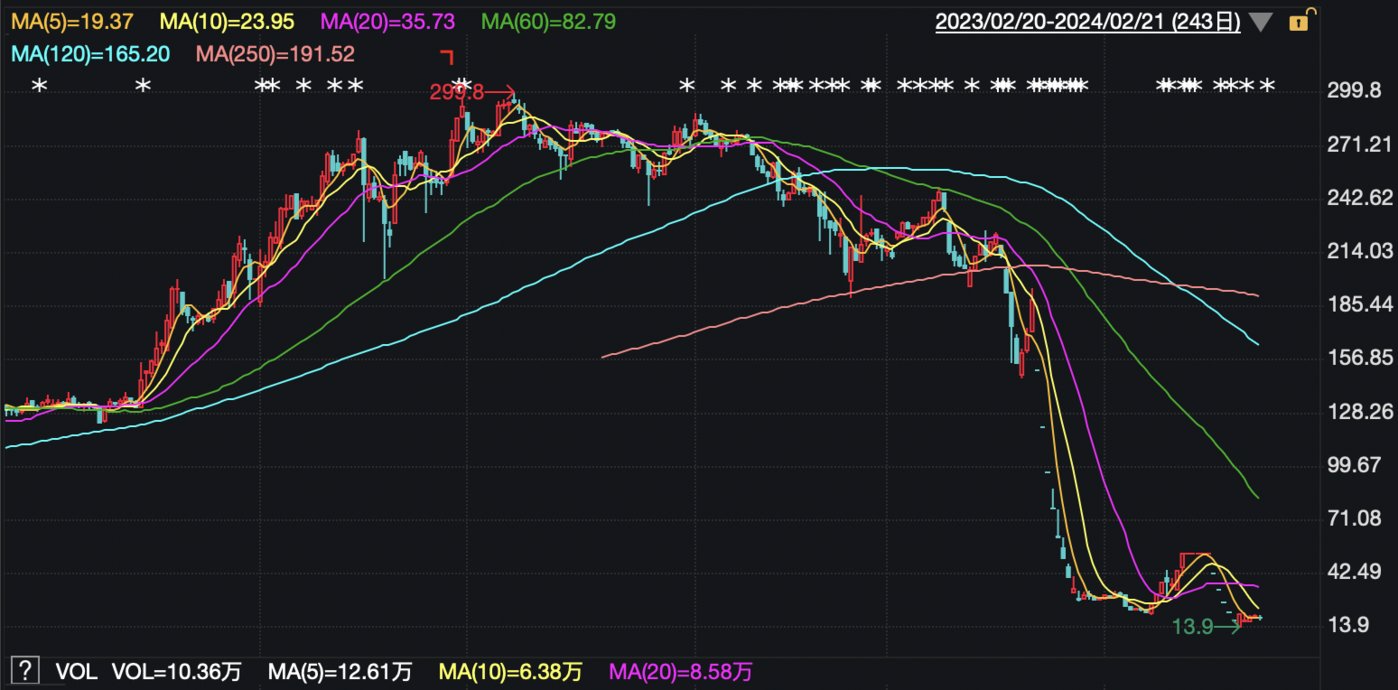 不过目前看来,由于涉嫌重大财务造假,不管公司加价换会计师事务所还是换财务总监都已于事无补。虚假繁荣破灭后,曾经的“史上最贵ST股”逐步跌落神坛。2023年7月14日,*ST左江触及上市以来最高点299.80元,公司市值也达到305亿元。而仅过了半年时间,公司股价已来到20元以下,截至2月21日收盘报18.99元,市值为19亿元,已蒸发286亿元。