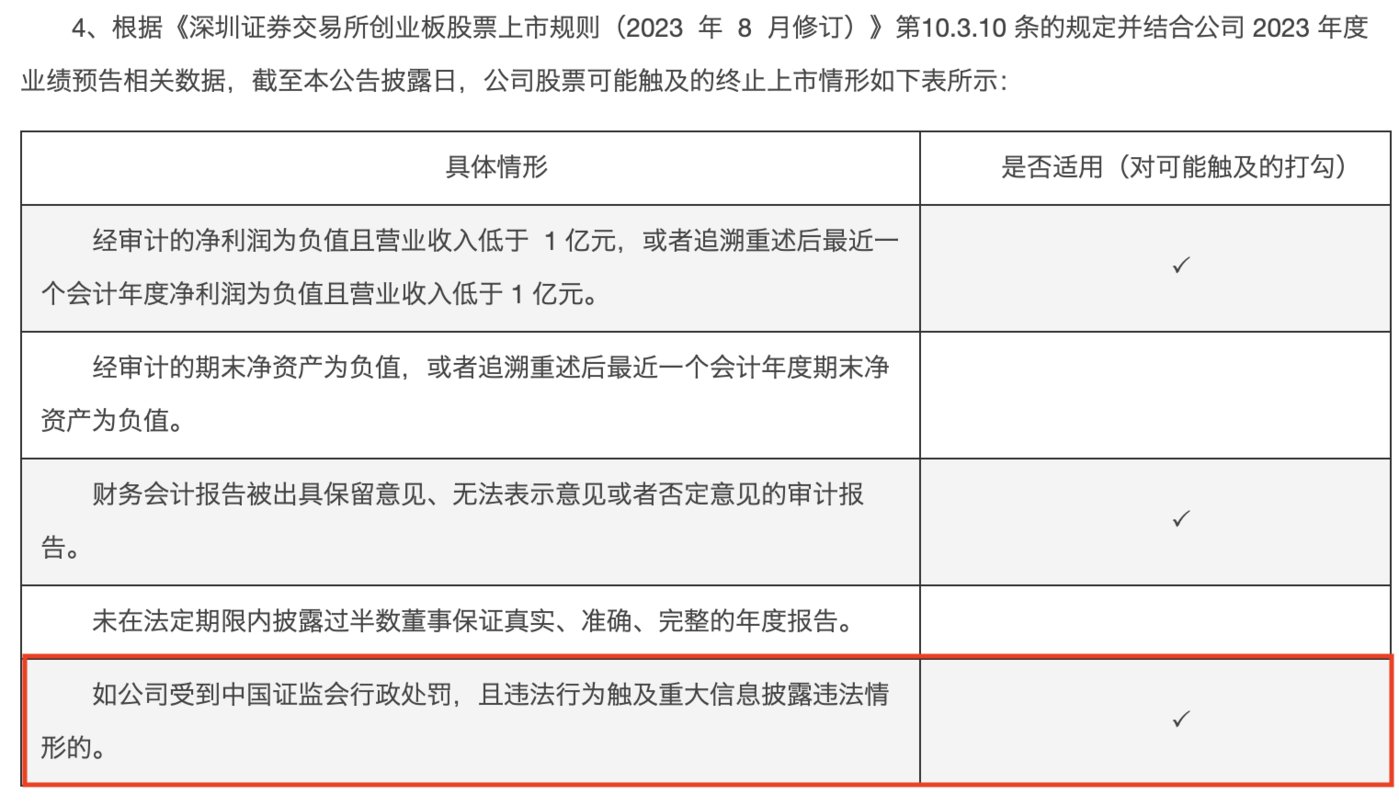 钛媒体APP注意到,相比今年1月31日披露的退市风险提示,本次公司的适用退市风险情形又新增了一条,即“如公司受到中国证监会行政处罚,且违法行为触及重大信息披露违法情形。”