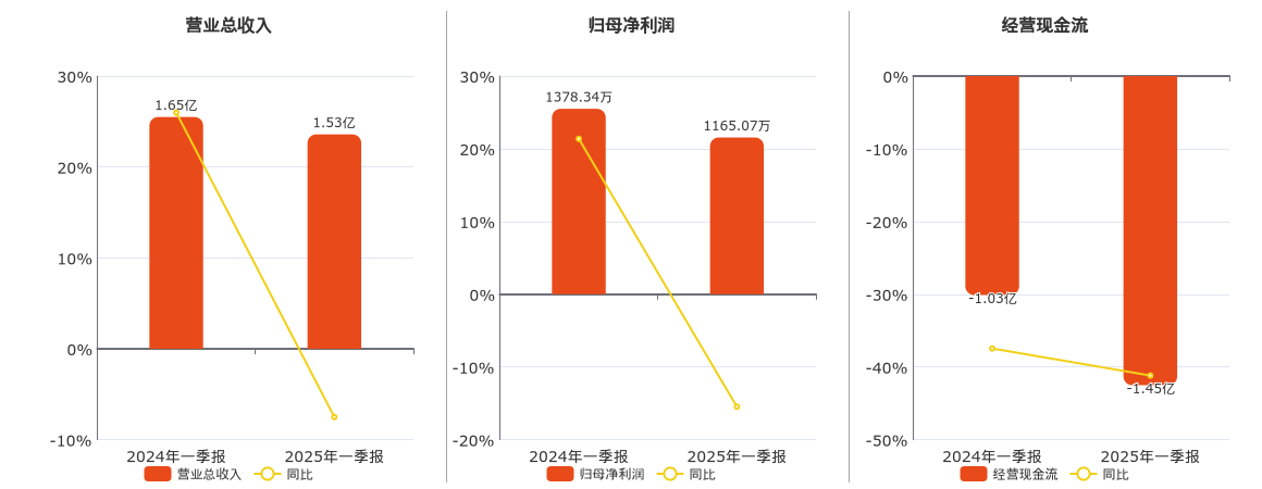 公司营业总收入为1.53亿元,较去年同报告期营业总收入减少1241.90万元,同比较去年同期下降7.51%。归母净利润为1165.07万元,较去年同报告期归母净利润减少213.27万元,同比较去年同期下降15.47%。经营活动现金净流入为-1.45亿元,较去年同报告期经营活动现金净流入减少4225.13万元。