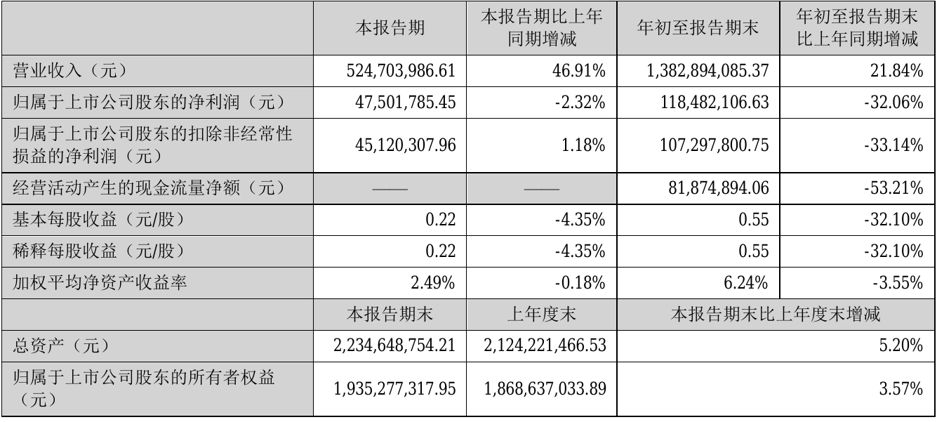 挖贝网10月25日,泰和科技(300801)近日发布2021年前三季度报告,报告期内营业收入1,382,894,085.37元,同比增加21.84%;净利118,482,106.63元,同比净利减少32.06%。