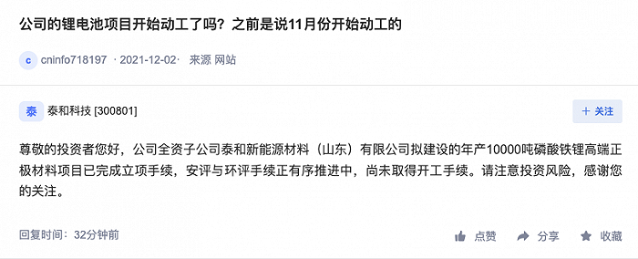 12月8日,泰和科技在深交所“互动易”平台回答投资者提问时称:公司全资子公司泰和新能源材料(山东)有限公司拟建设的年产10000吨磷酸铁锂高端正极材料项目已完成立项手续,安评与环评手续正有序推进中,尚未取得开工手续。