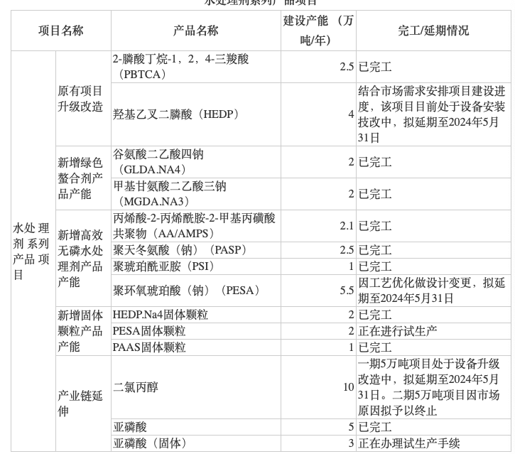 公司募投项目“水处理剂系列产品项目”原计划2023年5月31日完成,项目总投资是32488.02万元,拟使用募集资金投资额30854.01万元。截至2023年5月24日,公司水处理剂系列产品项目投资进度为91.79%,部分产品项目已完工,部分产品项目拟予以延期,部分产品项目拟予以终止,具体情况如下: