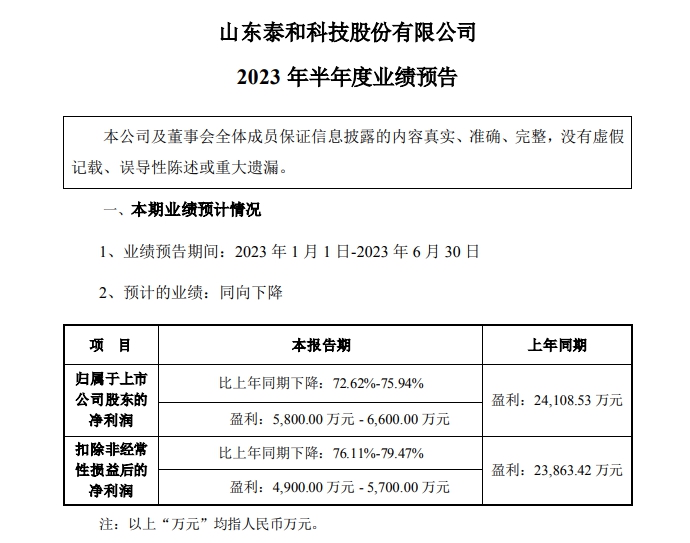 公告显示,2023年上半年,泰和科技预计归属于上市公司股东的净利润5800.00万元-6600.00万元,比上年同期下降72.62%-75.94%;预计扣除非经常性损益后的净利润4900.00万元-5700.00万元,比上年同期下降76.11%-79.47%。