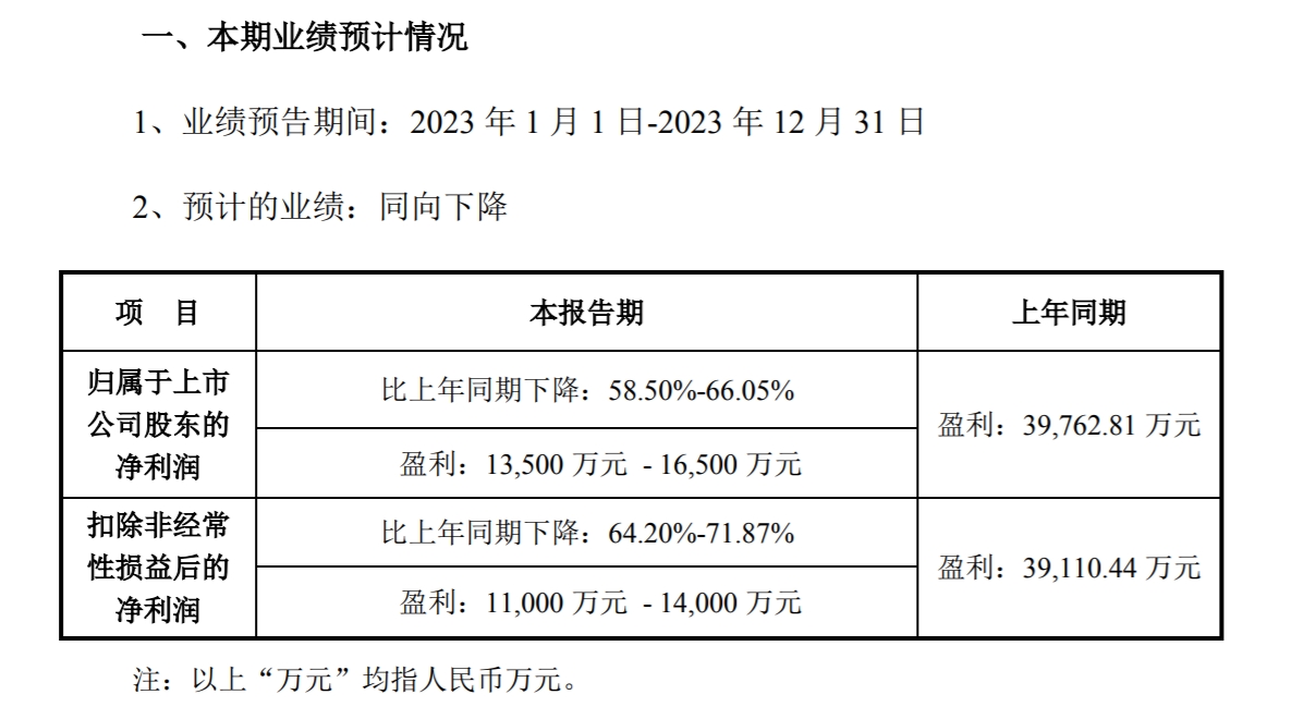 泰和科技预计,2023年,归属于上市公司股东的净利润为1.35亿元-1.65亿元,同比回落58.50%-66.05%;扣除非经常性损益后的净利润为1.10亿元-1.40亿元,同比回落64.20%-71.87%。