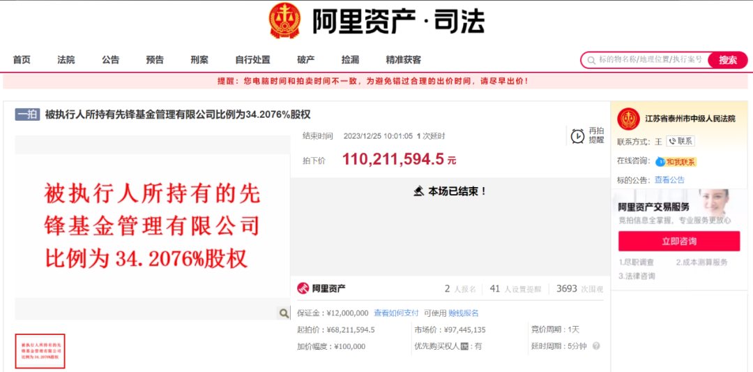 而从法院执行裁定书来看,前述拍卖的标的股权曾于2022年成功拍卖,2022年2月份,经过113次竞拍,金融老将朵元以最高价1.1亿元竞买成交先锋基金股权,法院依法向朵元出具拍卖成交确认书,但朵元未能向法院提交中国证监会核准同意其成为公募基金管理公司的股东的书面审批材料。因此,法院依法重新拍卖相关股权。