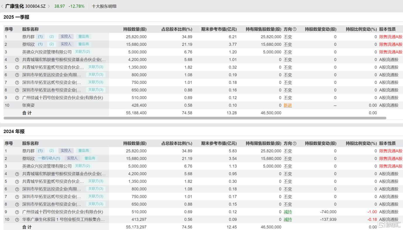 前十大股东中,2025年一季报显示,蔡丹群、蔡绍欣父子依然稳居前两大股东,持股数量分别为2582万股和1568万股,占比分别为34.89%和21.19%,未发生变化。